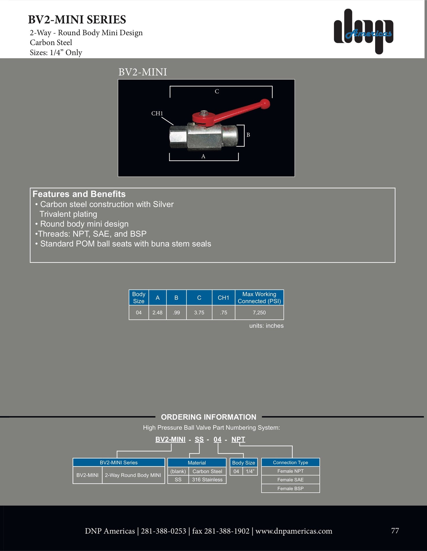 1/4" High Pressure Mini Valve, 2-way with 1/4" female BSP